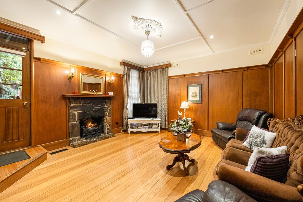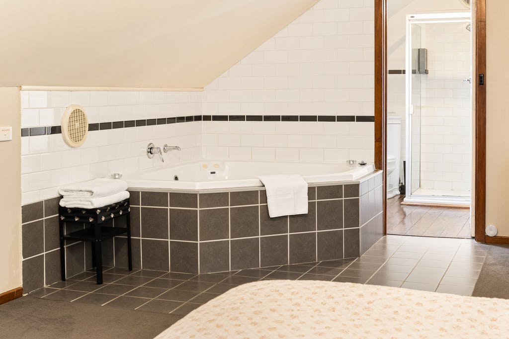 The Loft: a refurbished and spacious retreat boasting a gorgeous upstairs loft with contemporary king bedroom and balcony, double spa and separate bathroom and WIR. Downstairs is reminiscent of a gentleman’s lounge. Guests enter into the lounge with stone gas log fireplace, polished floor boards and period timber panelling adjacent to the kitchen and dining room.